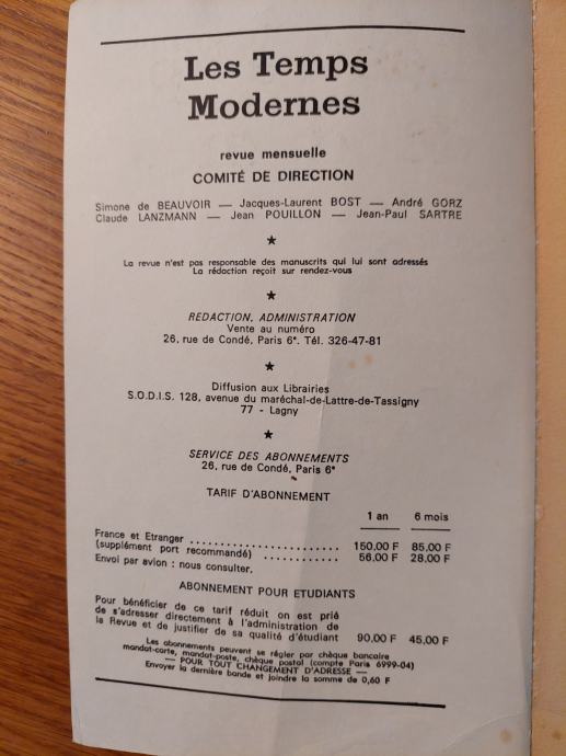 - Comité de Direction : Simone de BEAVUOIR , Jacques - Laurent BOST , André GORZ , Claude LANZMANN , Jean POUILLON , Jean - Paul SARTRE