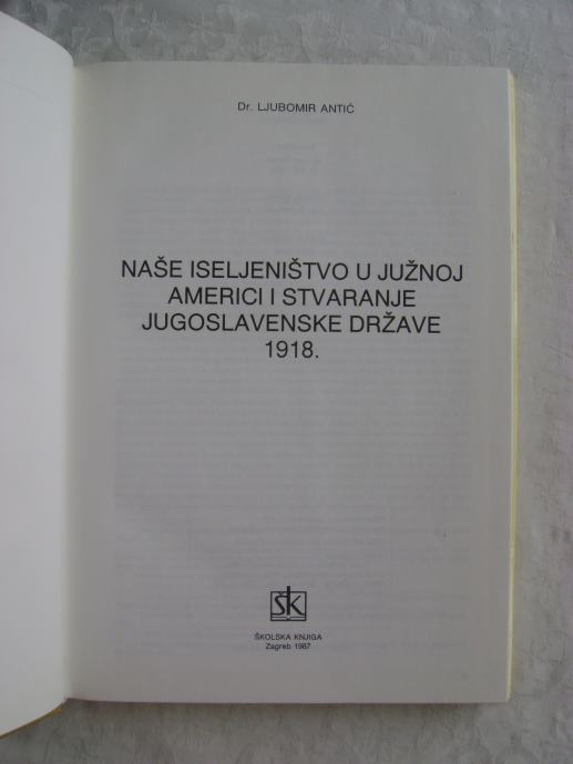 Ljubomir Antić - Naše iseljeništvo u Južnoj Americi i stvaranje jugoslavenske države 1918. - izdavač Školska knjiga, Zagreb 1987. godine, 17 x 24 cm, tvrdi uvez i papirnati omot, 222 stranice, ilustrirano.