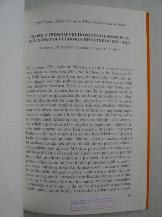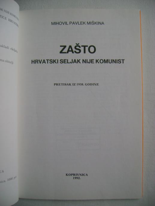 Mihovil Pavlek Miškina - Zašto hrvatski seljak nije komunist - PRETISAK knjige iz 1938. godine - izdavač Ogranak Matice hrvatske Koprivnica, 1992. godine, 15 x 23 cm, meki uvez sa preklopom, 40 stranica.