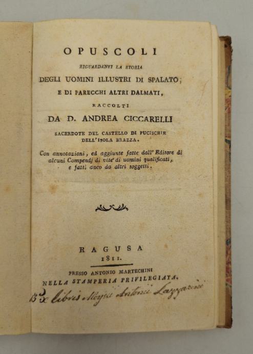 Andrija Ciccarelli: Opuscoli riguardanti la storia degli uomini illustri di Spalato; e di parecchi altri Dalmati, raccolti da d. Andrea Ciccarelli ...Ciccarelli, Andrija, hrvatski povjesničar (Pučišća, 29. III. 1759 – Pučišća, 14. X. 1823). Župnik u rodnomu mjestu, prikupljao gradivo o povijesti Brača, Splita i Trogira. Autor povijesno-arheoloških spisa o otoku Braču (1802), o uglednim Splićanima (1811), te kritičkih istraživanja (1814).Stranica: 107Dimenzije: 14x21Jezik: DubrovnikPismo: LatinicaStanje: Vrlo dobroUvez: TvrdiGodina: 1811