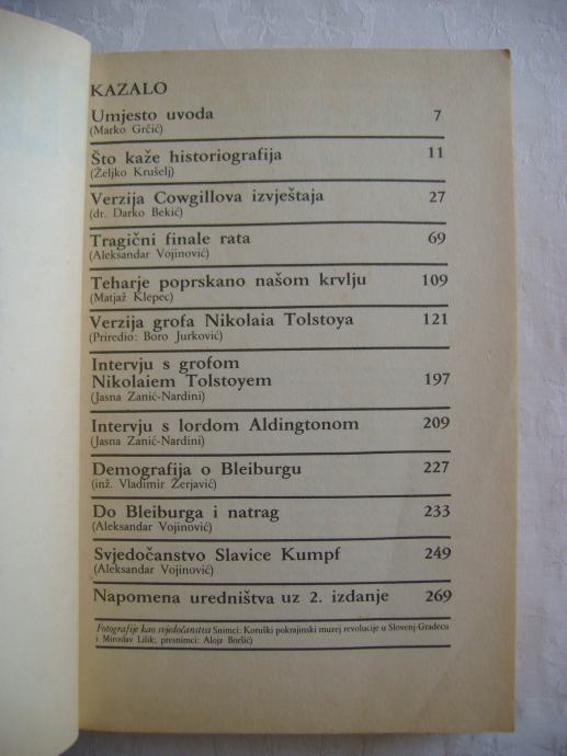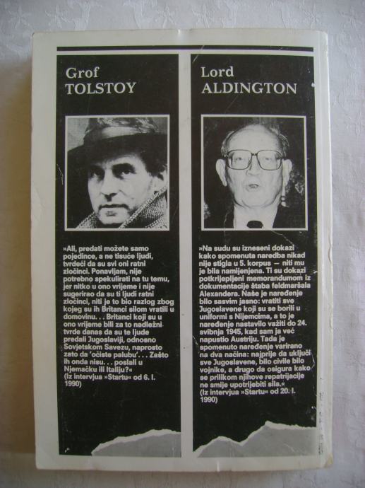 "Četrdeset i pet godina nakon svršetka Drugog svjetskog rata skinut je tabu s tragičnih događaja na austrijsko-jugoslavenskoj granici u svibnju 1945, kada je bez suđenja pobijen zasad neutvrđen broj pripadnika raznih kvislinških formacija što su se borile na strani Trećeg Reicha: ustaša, domobrana, belogardejaca, četnika, ljotićevaca, Kozaka... Ova knjiga donosi domaća i strana svjedočanstva o njima."