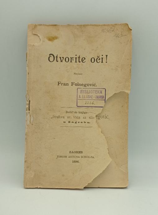 Fran Folnegović: Otvorite oči! Stranica: 140Dimenzije: 13x20.5Jezik: ZagrebPismo: LatinicaStanje: DobroUvez: MekiGodina: 1896