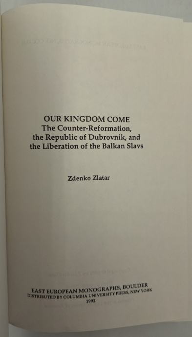 Zdenko Zlatar: Our kingdom comeAnalizia pokušaja stvaranja Kraljevstva Slavena, velike države na Balkanu naseljene Južnim Slavenima, početkom 17. stoljeća. Studija opisuje podršku pokreta i utjecaj protureformacije na Slavene u vrijeme kada je Osmansko Carstvo padalo. Stranica: 464Dimenzije: 15x12.5Jezik: New YorkPismo: LatinicaStanje: OdličnoUvez: TvrdiGodina: 1991