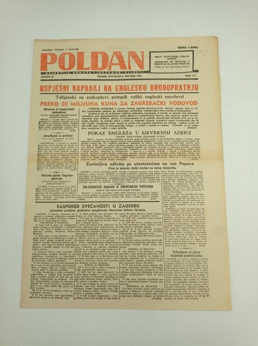 Poland br. 112/1942.Glavni urednik: Josip BlažinaStranica: 4Dimenzije: 28x39Jezik: ZagrebPismo: LatinicaStanje: OdličnoUvez: MekiGodina: 1942