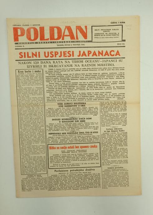 Poldan br. 113/1942.Glavni urednik: Josip BlažinaStranica: 4Dimenzije: 28x39Jezik: ZagrebPismo: LatinicaStanje: OdličnoUvez: MekiGodina: 1942