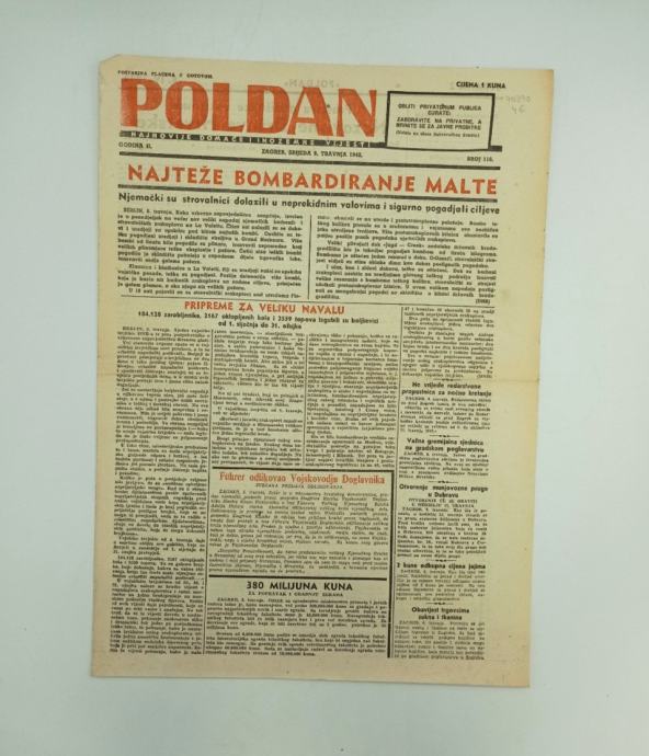 Poldan br. 116/1942.Glavni urednik: Josip BlažinaStranica: 4Dimenzije: 28x39Jezik: ZagrebPismo: LatinicaStanje: OdličnoUvez: MekiGodina: 1942