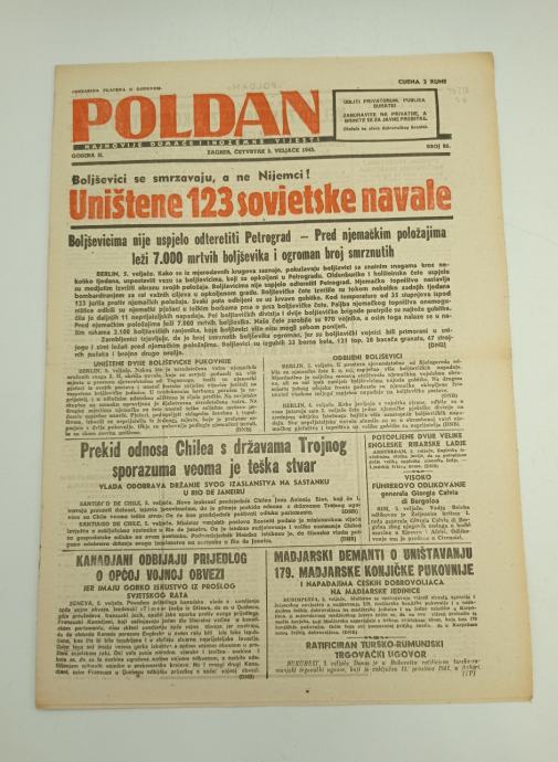 Poldan br. 65/1942.Glavni urednik: Josip BlažinaStranica: 12Dimenzije: 28x39Jezik: ZagrebPismo: LatinicaStanje: OdličnoUvez: MekiGodina: 1942
