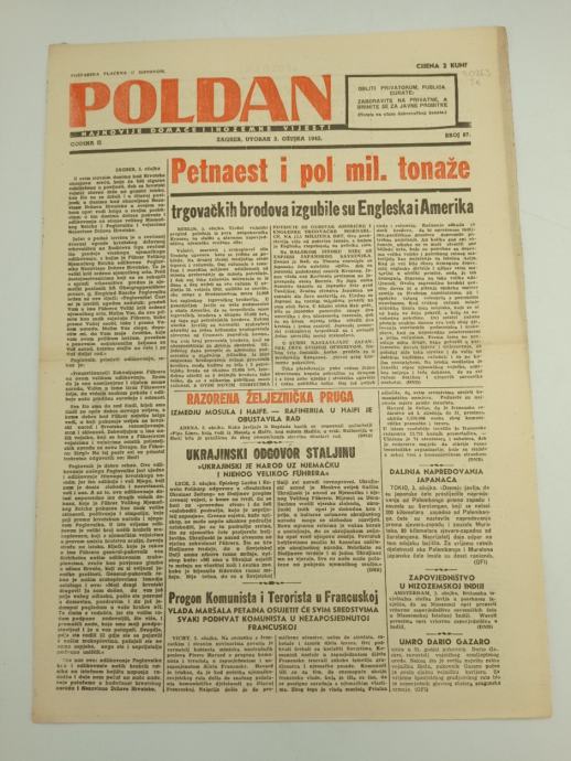 Poldan br. 87/1942.Glavni urednik: Josip BlažinaStranica: 8Dimenzije: 28x39Jezik: ZagrebPismo: LatinicaStanje: OdličnoUvez: MekiGodina: 1942