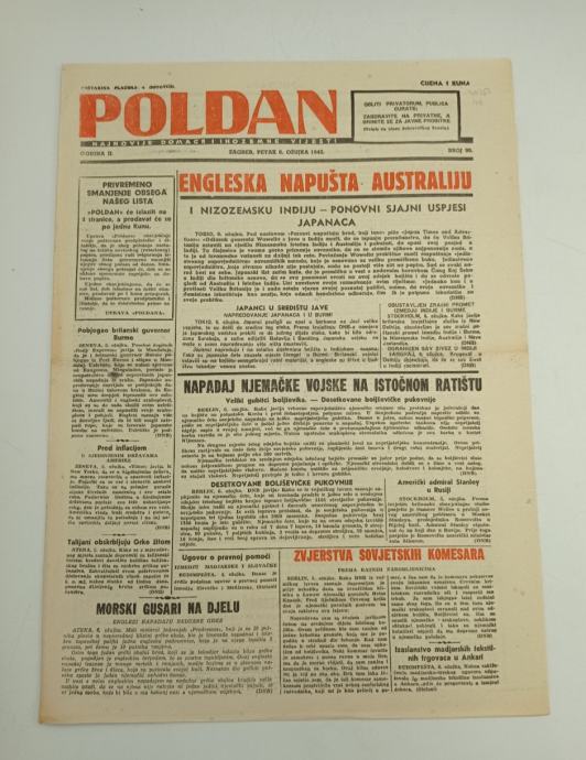 Poldan br. 90/1942.Glavni urednik: Josip BlažinaStranica: 4Dimenzije: 28x39Jezik: ZagrebPismo: LatinicaStanje: OdličnoUvez: MekiGodina: 1942