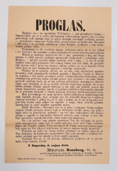 Hermann von Ramberg: ProglasHermann von Ramberg (Beč,1820. - Graz, 1899.) bio je austro-ugarski konjički general i kraljevski povjerenik s ovlastima bana Kraljevine Hrvatske i Slavonije tijekom 1883.Vrlo rijetko!Stranica: -Dimenzije: 26x43.5Jezik: ZagrebPismo: LatinicaStanje: OdličnoGodina: 1883
