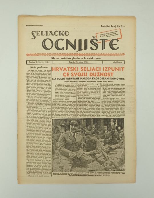 Seljačko ognjište br. 31/1943.Glavno ustaško glasilo za hrvatsko seloOdgovorni urednik: Nikola KiriginStranica: 16Dimenzije: 28.5x40Jezik: ZagrebPismo: LatinicaStanje: DobroUvez: MekiGodina: 1943
