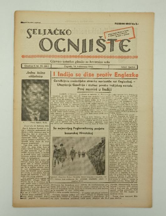 Seljačko ognjište br. 33/1942.Glavno ustaško glasilo za hrvatsko seloOdgovorni urednik: Nikola KiriginStranica: 12Dimenzije: 28.5x40Jezik: ZagrebPismo: LatinicaStanje: DobroUvez: MekiGodina: 1942