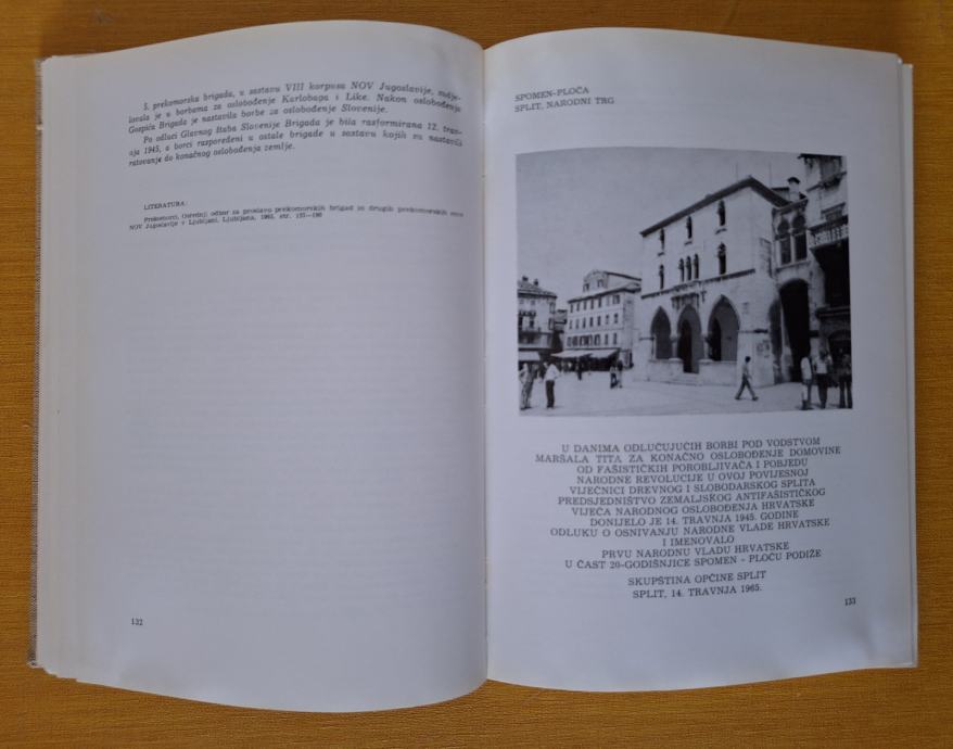 Opis: Knjiga sadrži sva spomen-obilježja posvećena događajima iz povijesti radničkog pokreta i narodnooslobodilačke borbe Općine Split. Knjiga sadrži popis spomenika, poprsja, mozaika, reljefa, fresaka, spomen-ploča i spomen kosturnica, kao i popis obilježja na kojima su radovi na njihovom podizanju. Treći dio knjige sadrži popis ulica i institucija. na kraju knjige su dvije rasklopne karte s označenim lokacijama svih spomen-obilježja.