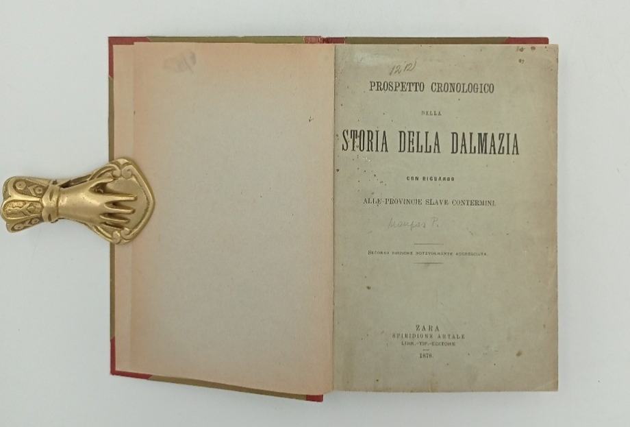 Maupas, Petar Dujam:Prospetto cronologico della storia della Dalmazia : con riguardo alle provincie slave contermini.Sadržaj: 1. Prospetto cronologico della storia civile della Dalmazia ; 2. Prospetto cronologico della storia ecclesiastica della Dalmazia.Sadrži kronološki pregled političke povijesti Dalmacije od 1510. god. pr. Krista do 1875. god. poslije Krista kao i kronološki pregled crkvene povijesti Dalmacije od rođenja Kristova do 1872. god. Stranica: 429Dimenzije: 15.5x22Jezik: ZadarPismo: LatinicaStanje: Vrlo dobroUvez: TvrdiGodina: 1878