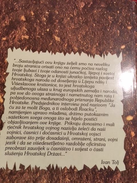 U knjizi je ukratko iznijeta povijest hrvatskoga naroda od doseljenja u Lijepu našu i Višeslavove krstionice, to jest hrvatskoga uljudbenog ulaza u krug europskih zemalja i naroda, pa sve do ovoga strašnoga i nametnutog nam rata i pobjedonosna međunarodnoga priznanja Republike Hrvatske.(iz tiska)