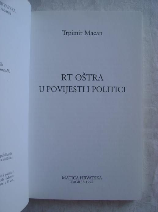 Trpimir Macan - Rt Oštra u povijesti i politici - izdavač Matica hrvatska, Zagreb 1998. godine, 12 x 19 cm, meki uvez, 141 stranica, ilustrirano.