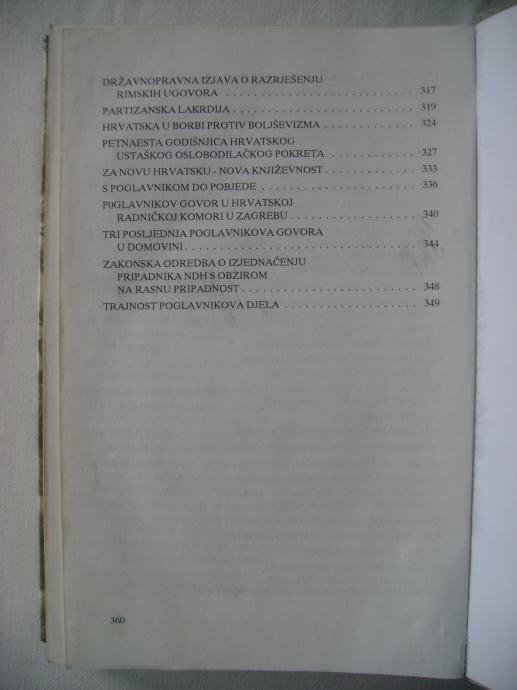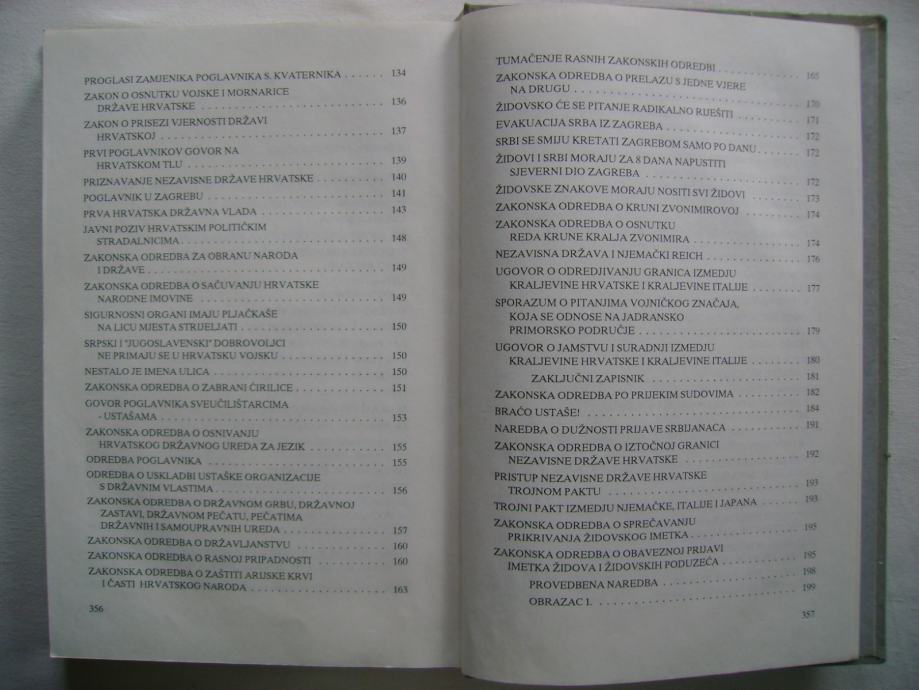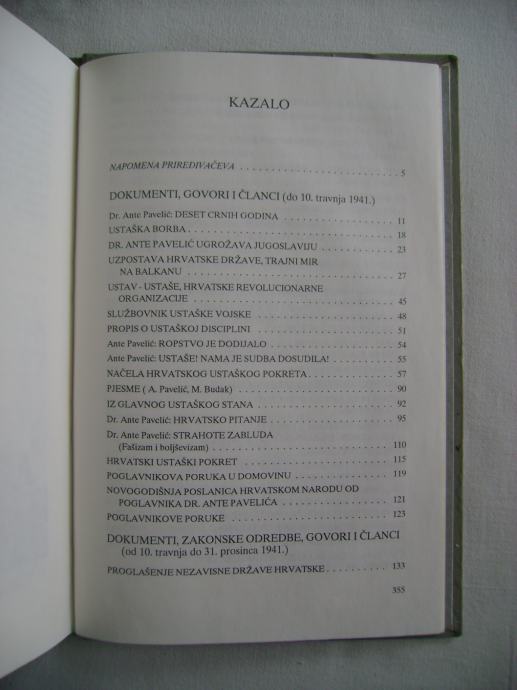 "Knjiga sadrži različite autentične dokumente i tekstove ustaškog pokreta do svibnja 1945. godine. Tu su govori, članci, proglasi, odredbe Ante Pavelića i njegovog suradnika Stanka Kvaternika. Navedena je, također, sva dokumentacija vezana za uspostavu, ustroj i djelovanje Nezavisne Države Hrvatske: zakonske odredbe, tumačenje tih odredaba, razni ugovori, naredbe, propisi, državopravne izjave i smjernice. Svi ti dokumenti sakupljeni na jednom mjestu omogućit će čitateljima da se upoznaju s ustaškim pokretom, njegovim idejama i ostvarenjima."