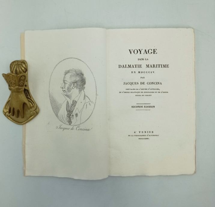 Jacques Concina: Voyage dans la Dalmatie maritime en MDCCCIV. par Jacques de Concina chevalier de l'Empire d'Autriche, de l'ordre militaire de Jerusalem et de l'ordre royal du ChristDrugo izdanje. Slika autora na stranici nasuprot naslovnoj. Sadržaj. Djelo prvi put objavljeno na talijanskom 1809. godine (Viaggio nella Dalmazia litorale). U obliku poslanica (24 poslanice) opisani arheološki i povijesni spomenici krajeva kroz koje je autor prolazio. Podaci o onodobnom gospodarstvu, društvu, kulturi, učenim ljudima.Giacomo de Concina (San Daniele del Friuli, oko 1775. - ?) - talijanski povjesničar i putopisac. Od 1803. tajnik povjerenstva za ustroj Istre, Dalmacije i Albanije sa sjedištem u Zadru. Počasni član zadarske Gospodarsko-poljodjelske akademije.Stranica: 84Dimenzije: 14x22Jezik: VenecijaPismo: LatinicaStanje: Vrlo dobroUvez: MekiGodina: 1831