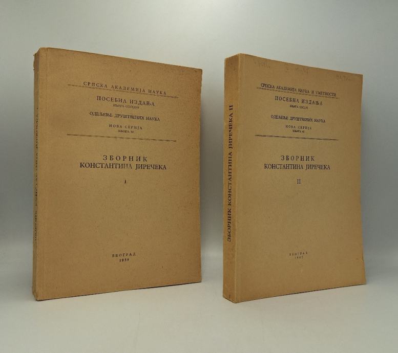 Mihailo Dinić: Zbornik Konstantina Jirečeka I-IIUredio Mihailo Dinić. Sadržaj: I. Knjiga: Vojna mesta od Beograda za Carigrad i balkanski klanci, Vlasi i mavrovlasi u dubrovačkim spomenicima; Trgovački putevi i rudnici Srbije i Bosne u srednjem vijeku; Nastojanje starijih Dubrovčana oko raširenja granice, Viteške igre u srednjovekovnoj Srbiji; Hrišćanski elemenat u topografskoj nomenklaturi balkanskih zemalja itd; II. Knjiga: Romani u gradovima Dalmacije tokom srednjega veka. Stranica: 565+366Dimenzije: 17x24.5Jezik: BeogradPismo: ĆirilicaStanje: Vrlo dobroUvez: MekiGodina: 1959