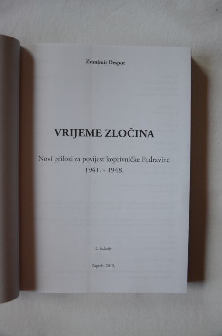 Zvonimir Despot - Vrijeme zločina - Novi prilozi za povijest koprivničke Podravine 1941. - 1948. godine - izdavač Despot Infinitus, Zagreb 2013. godine, meki uvez sa preklopom, 459 stranica, ilustrirano.