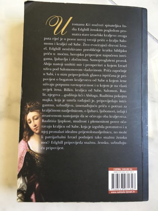 U romanu "Kći mudrosti" spisateljica India Edghill ženskim pogledom promatra stare izraelske kraljeve: ovoga puta riječ je o posve novoj verziji priče o kralju Salomonu i kraljici od Sabe. Živo evocirajući drevni Izrael, Edghill neočekivano preobličuje kratku biblijsku priču u moćnu, herojsku pripovijest napučenu intrigama, ljubavlju i zločincima.