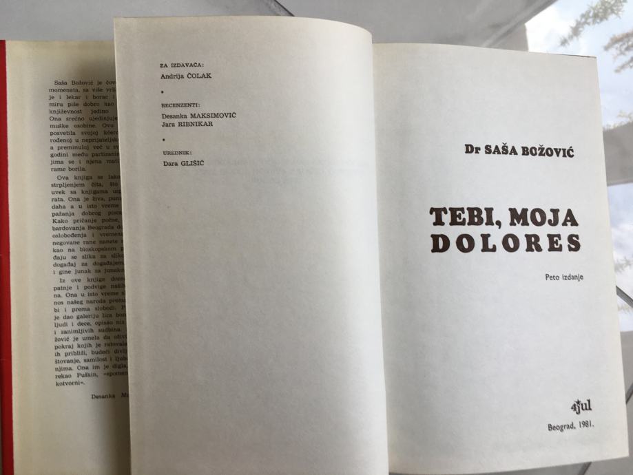 Godine 1980. najčitanija knjiga u SFRJ bila je “Tebi, moja Dolores” dr Saše Božović. To potresno svjedočanstvo o tragediji jedne majke, u kome se ogleda stradanje čitavog naroda u Drugom svjetskom ratu. Mlađoj publici ovo autobiografsko djelo kao i ime autora, poznate lekarke i humaniste, ne znači mnogo. Iako najviše govori o ratnom vremenu (1941-1945) iz perspektive učesnika partizanskog pokreta (što odavno nije "in"), knjiga nadrasta ideološku isključivost dajući uverljivu, potresnu priču o ljudskoj patnji, bolu i nesreći.