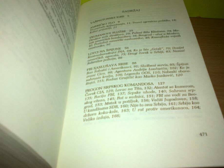 Pokušaj da se razreše neke od najvećih misterija naše novije političke istorije i da se odgovori na pitanja da li su i kako Srbi radili za CIA, ko je bio tajni agent Grizli, kad i gde je FBI hapsio i saslušavao Srbe, ko su Cimermanovi ljudi u Beogradu, ko je ubio Jugoslaviju?...