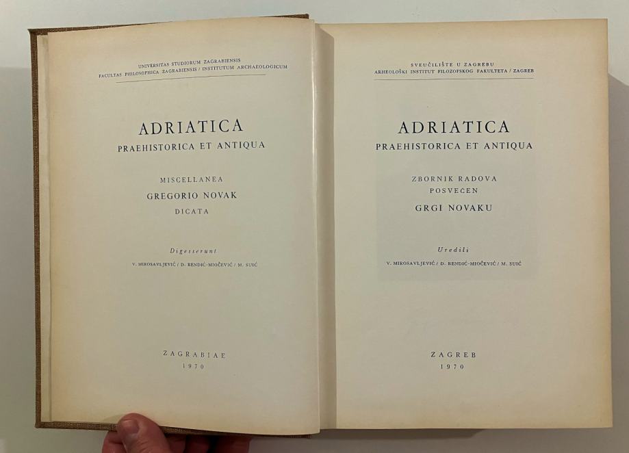 Zbornik radova posvećen Grgi Novaku. Uredili: V. Mirosavljević / D. Rendić-Miočević / M. Suić. Namjera urednika, pokretača zbornika, bila je okupiti istaknute znanstvenike iz naše zemlje i inozemstva i obraditi složene i još uvijek nedovoljno istražene problematike starije prošlosti jadranskog područja.