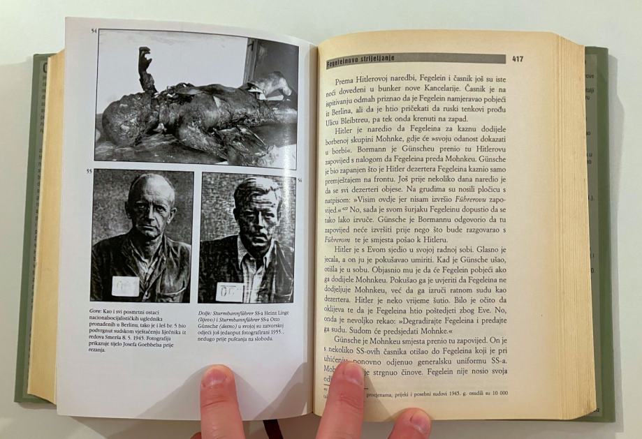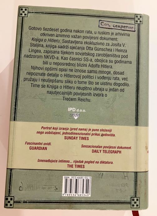 Ova je knjiga u početku imala samo jednog čitatelja: Josifa V. Staljina a zatim je na više od pet desetljeća nestala u ruskim arhivima. Sovjetski diktator nije vjerovao u vijest o samoubojstvu Adolfa Hitlera. Stoga je sve svoje napore uložio kako bi pronašao preživjele bliske nacističkome vodi, i na temelju njihovih izjava otkriti istinu. Sovjetska je tajna služba zarobljavanjem Otta Günschea | Heinza Lingea postigla taj cilj. Vođi nacionalsocijalističkog režima tijekom svih tih godina nitko nije bio toliko blizak kao ta dvojica. Oni su Hitlera doživjeli iz neposredne blizine, znali su njegov dnevni raspored, prehrambene navike, njegova raspoloženja i povijest bolesti. Kao ađutanti, upoznali su svojega poslodavca kao službenog šefa vlade i čuli njegovo mišljenje o svojim posjetiteljima, generalima i starim životním suputnicima. U posljednjim su mjesecima i tjednima bili uz Hitlera i iz berlinskog Führerova bunkera promatrali kako Treći Reich vodi u katastrofu. Günsche i Linge također su ga upoznali kao vrhovnog zapovjednika njemačke vojske u pobjedi i porazu. Günsche je sudjelovao na strateškim sastancima s kojih, zbog ratnog kaosa, nije sačuvan nijedan zapisnik. Tako je 1948./49. nastalo jedinstveno djelo prema sjećanjima dvaju Hitlerovih suvremenika, te je jedan od najdojmljivijih povijesnih izvora o Trećem Reichu. Budući da je nastao nedugo nakon opisanih događaja, tekst odlikuje visoka razina autentičnosti koju su potvrdila I Istraživanja provedena tijekom prošlog desetljeća. Günscheova i Lingeova sjećanja pružaju zaprepašćujuće uvide u svakodnevno funkcioniranje Führerove države. lako se povijest Trećega Reicha ne mora ponovno pisati, detalji koje čitatelj doznaje u Knjizi o Hitleru iznimno su povijesno važni.