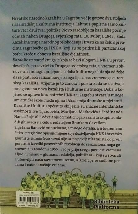 Snježana Banović minuciozno, s mnogo detalja, a istovremeno čitko i pregledno opisuje mijene koje doživljavaju HNK i hrvatsko glumište. Kazalište za narod nije samo povijest kazališta od prvih poratnih izvedbi posvećenih revoluciji do senzacionalnoga gostovanja u Londonu 1955., već je prije svega povijest vremena i ljudi u njemu – glumaca, redatelja, političara – koji su stvarali i utemeljili našu suvremenu scenu, a kroz čije se sudbine prelama i naše današnje vrijeme.