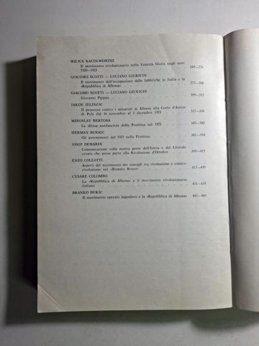 Zastupljeni autori: Čulinović, Ferdo; Erceg, Ivan; Crnobori, Tone; Despot, Miroslava; Kopitar-Cetina, Marija; Sala, Teodoro; Stulli, Bernard; Bratulić, Vjekoslav; Medarić, Jura; Legović, Marko; Kacin-Wohinz, Milica; Scotti, Giacomo; Giuricin, Luciano; Jelinčić, Jakov; Bertoša, Miroslav; Buršić, Herman; Demarin, Josip; Đukić, Branko; Oštrić, Vlado; Collotti, Enzo; Colombo, Cesare.