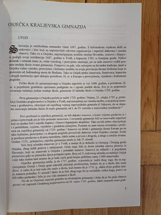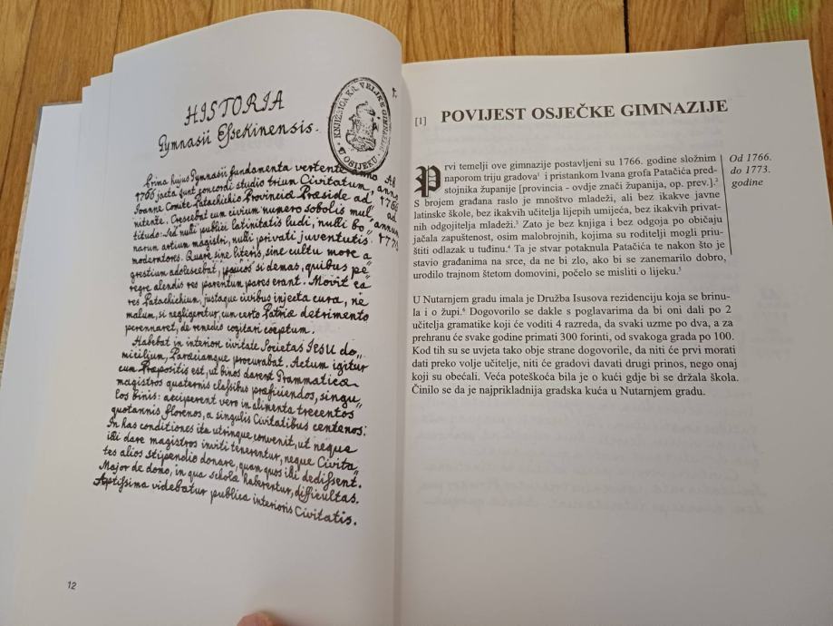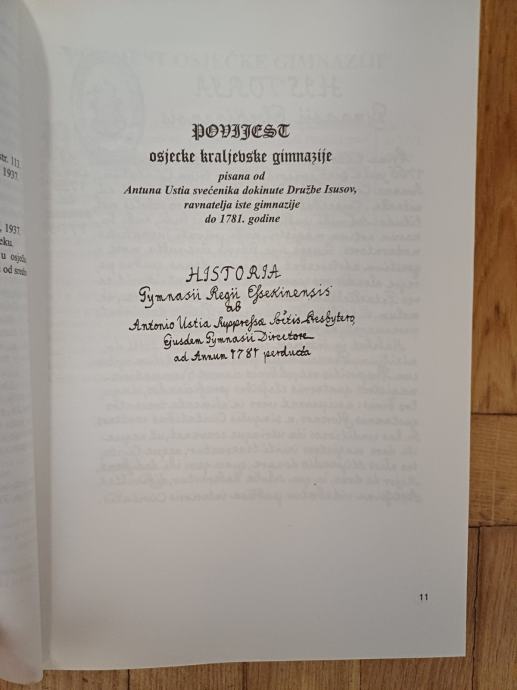 Povijest osječke Kraljevske gimnazije počeo je zapisivati njezin profesor i ravnatelj Antun Ustia 1765. godine do svoje službe 1783. godine, kada su je nastavili pisati franjevački ravnatelji sve do 1838. godine. U povijest su upisivali podatke o početku i završetku školske godine, semestralnim i završnim ispitima, broju učenika, profesorima, značajnijim školskim i gradskim promjenama, klasifikacijama i svečanostima na kraju godine s deklamacijama na više jezika, o zgradi gimnazije, školarini i pojedinim značajnijim događajima vezanim uz školu. Povijest je ovdje objavljena na latinskom izvorniku, u rukopisu te u prijevodu na hrvatski jezik. Na kraju knjige je sažetak, paralelno i na engleskom i njemačkom jeziku, kazalo pojmova, imena i mjesta.