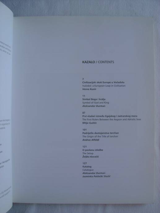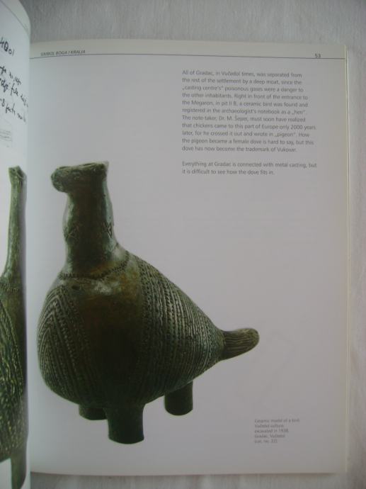 Ovo je katalog izložbe o vučedolskoj kulturi (3000. - 2004. g. pr. Kr.) održane u Galeriji Klovićevi dvori kojom se javnost ponovno upozorava na važnost te kulture za civilizacijski razvoj Europe. Ljudi obično vučedolsku kulturu povezuju sa skulpturom golubice, a zapravo jarebice, kako to lijepo autor izložbe dokazuje. Manje je poznata činjenica da je vučedolska kultura prva na ovim prostorima ovladala tehnologijom serijske proizvodnje bakrenih sjekira koje su, osim kao standardno naoružanje prve europske vojske, služile i kao simbol boga i kralja. Vučedolska kultura poznata je i po najstarijem europskom kalendaru zapisanom na jednoj keramičkoj posudi. Sam katalog izložbe, osim uvodnog teksta Vesne Kusin, teksta o postavi izložbe Željka Kovačića i popisa izloženih arheoloških nalaza, sadrži tri teksta znanstvenog karaktera. Prvi pod naslovom Simbol boga i kralja dolazi iz pera autora izložbe Aleksandra Durmana, profesora arheologije na zagrebačkom Filozofskom fakultetu i danas najboljeg poznavatelja vučedolske kulture. Drugi je tekst naslovljen kao Prvi vladari između Egejskog i Jadranskog mora napisao je slovenski arheolog Mitja Guštin, dok je kao treći tekst objavljena studija mađarskog znanstvenika Androsa Alfoldija koja govori o podrijetlu institucije kralja."