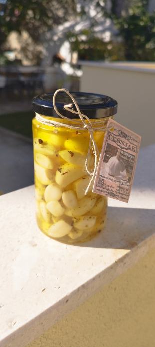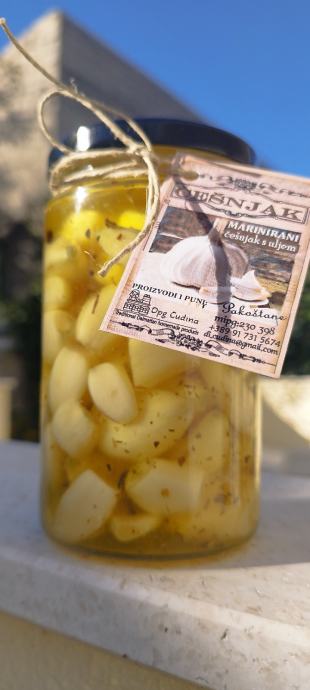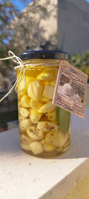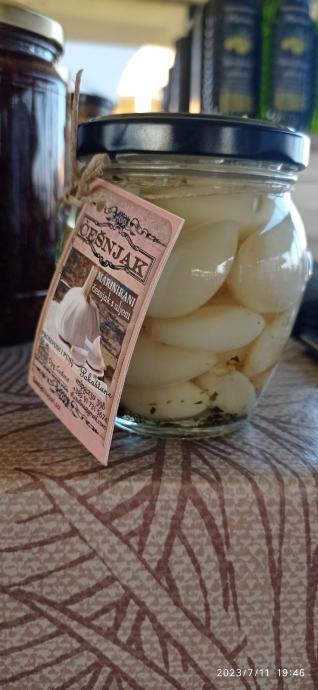 Domaći ćešnjak mariniran u vinu i octu . Punjen u teglice sa nerafiniranim suncokretovim uljem i začinima.