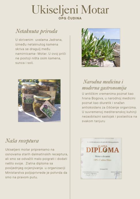 Mnogi ljeti leže pored ove samonikle biljke, ne znajući da se zapravo nalaze pored velike delicije. Ovaj cvijet u kamenu, motar, matar ili petrovac bio je hrana bogova, cijenjena biljka u biblijskim vremenima o kojoj je pisao i slavni Shakespeare. Ukusan je i dostupan, na neko vrijeme zaboravljen, a sada se smatra velikom delicijom koja se služi na bogatim dalmatinskim platama.