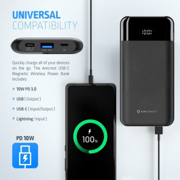 Vrsta baterije: Li-ionska baterija Kapacitet: 10.000 mAh Lightning ulaz: DC5V/2A, 9V/2A Type-C ulaz: DC5V/3A, 9V/2A USB izlaz: DC5V/4.5A, 4.5A/5A, 9V/2A, 12V/1.5A Type-C izlaz: DC5V/3A, 9V/2.2A, 12V/1.5A 10W PD USB-C priključak i 1 x Light Port ulaz Ovaj uređaj ima Type-C USB ulaz/izlaz, Lightning ulaz, gumb za uključivanje/isključivanje, priključak za brzo punjenje i digitalni zaslon Digitalni zaslon prikazuje trenutnu razinu baterije power bank-a Najbrži način punjenja uređaja bio bi Type-C USB ulaz, jer se uređaj može napuniti do 6 sati Dimenzije: 5,66 x 2,79 x 0,47 inča Težina: 0,49 funti (225 g)