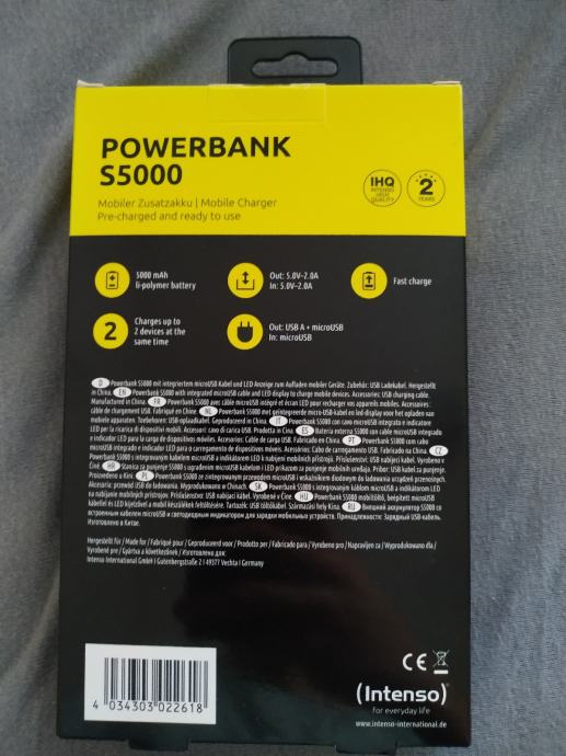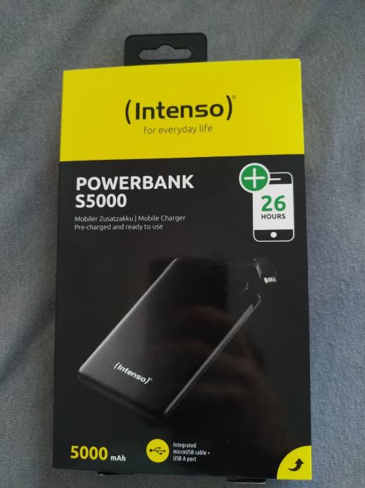 Prodaje se novi powerbank S5000 Intenso sa ugrađenim microUSB kabelom i LED prikazom za punjenje mobilnih uređaja