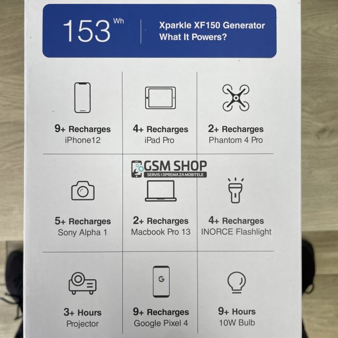 Stanicu napaja LiFePO4 baterija visokih performansi s vijekom trajanja do 2000 ciklusa, što je 2 do 4 puta dulje nego kod litij-ionskih baterija. Štoviše, s kapacitetom od 153 Wh možete puniti iPhone 12 10 puta, iPad Pro 4 puta ili dron Phantom 4 Pro 4 puta. Napomena: XF150 nije kompatibilan s uređajima čija snaga prelazi 200 W.