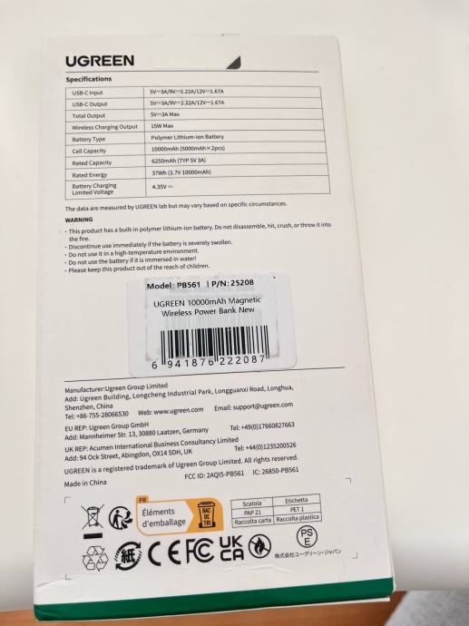 Novi neotvoreni magnetski power bank od 10000mAh. Bijela boja. Brand UGREEN - meni osobno najbolji izdavač opreme za punjenje mobilnih uređaja