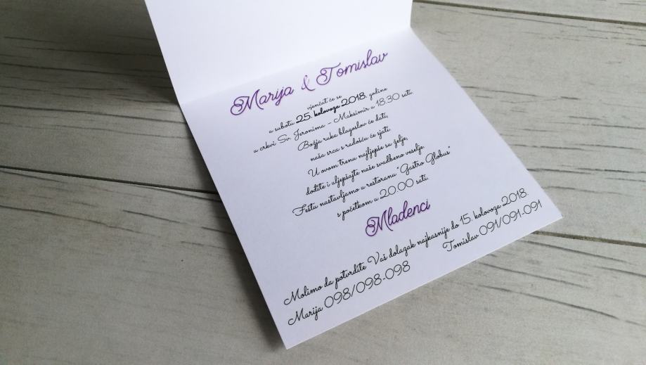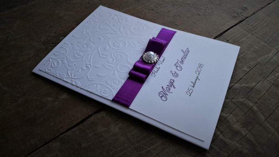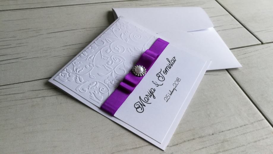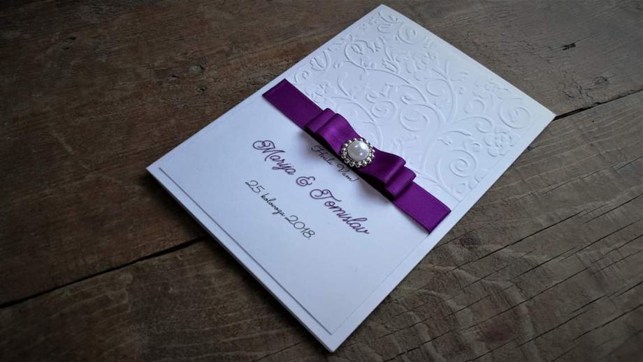 Pozivnica je izrađena od više slojeva bijelih mat papira, dodatno ukrašena reljefnom strukturom, dekorirana satenskom trakom te elegantnim brošem.
