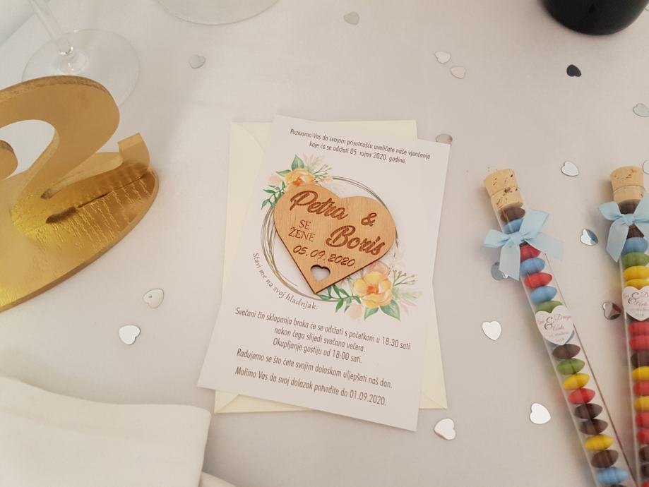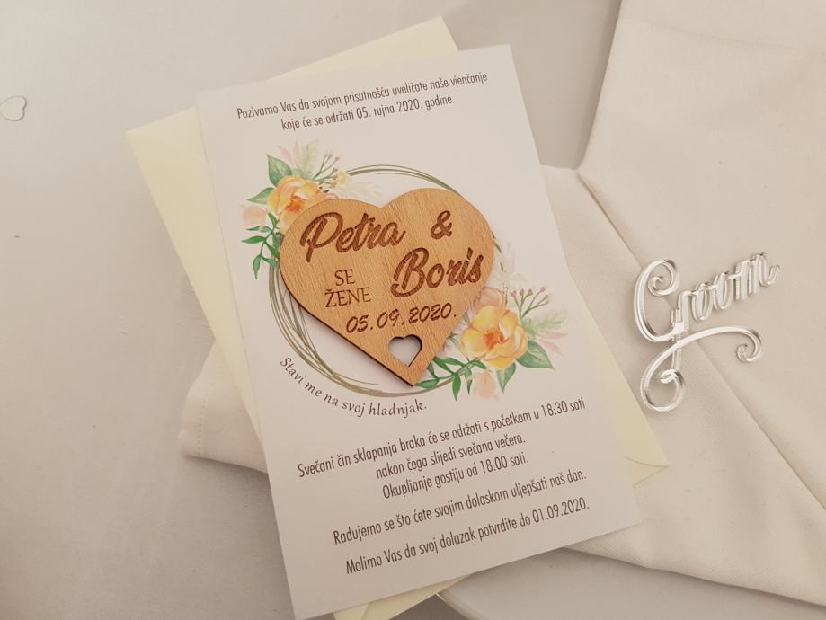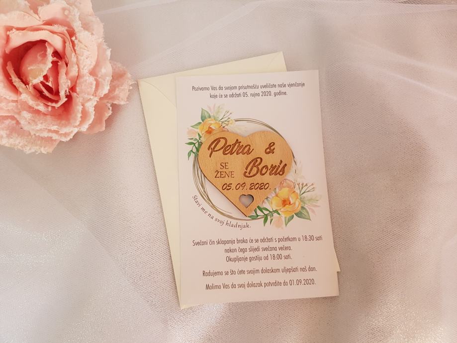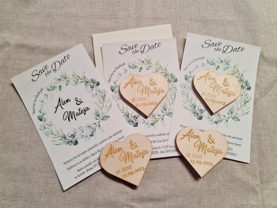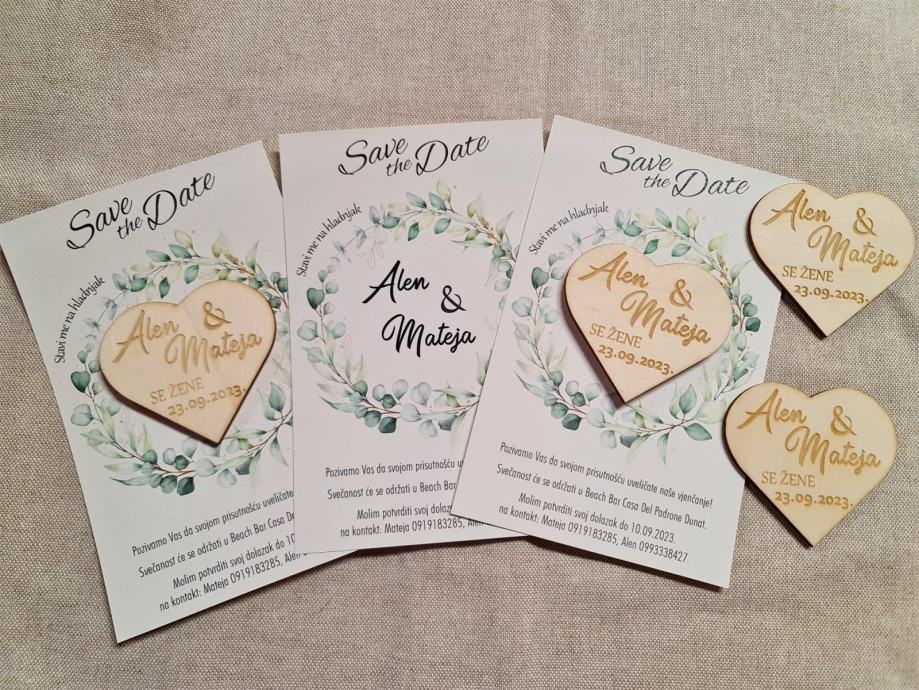 Naše najnovije pozivnice dolaze sa magnetom koje svatovi mogu skinuti i staviti na svoj frižider kako ne bi zaboravili datum vaše svadbe.