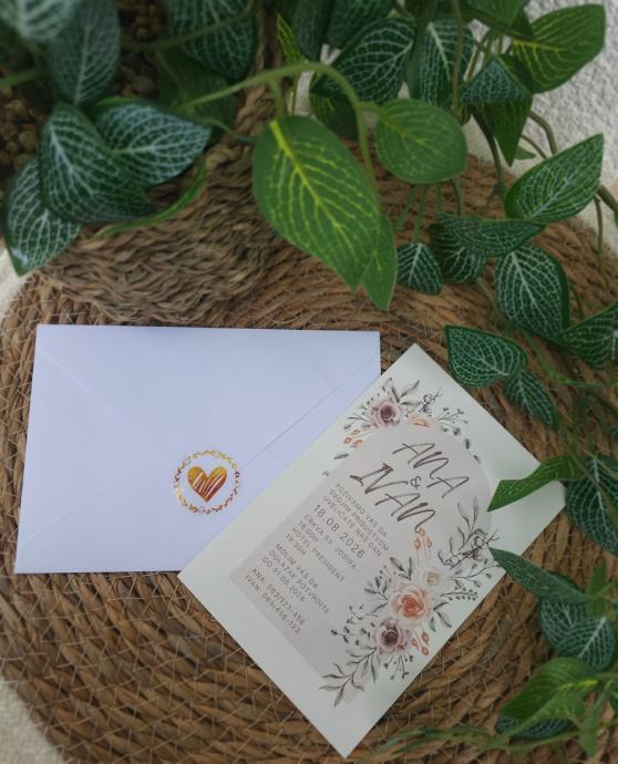 Unesite dašak romantike i profinjenosti u svoj poseban dan uz našu modernu pozivnicu s luksuznim detaljima. Minimalistički dizajn, nježne ilustracije i zlatni pečat u obliku srca stvaraju savršenu kombinaciju elegancije i topline.
