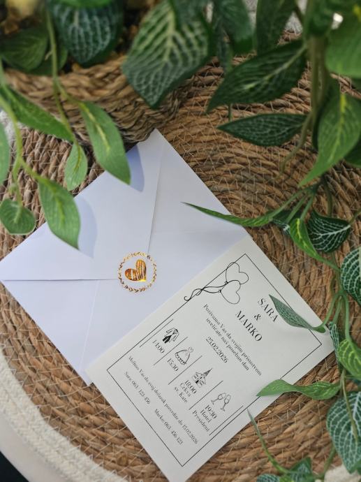 Unesite dašak romantike i profinjenosti u svoj poseban dan uz našu modernu pozivnicu s luksuznim detaljima. Minimalistički dizajn, nježne ilustracije i zlatni pečat u obliku srca stvaraju savršenu kombinaciju elegancije i topline.
