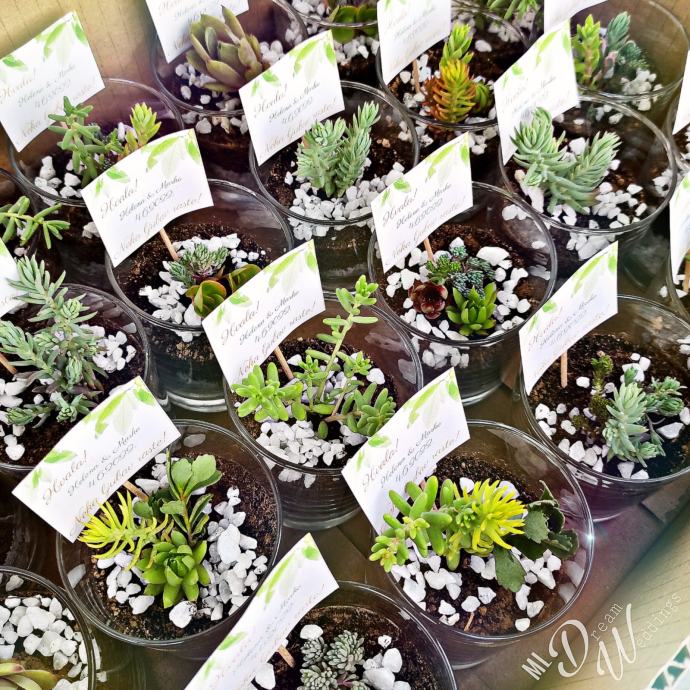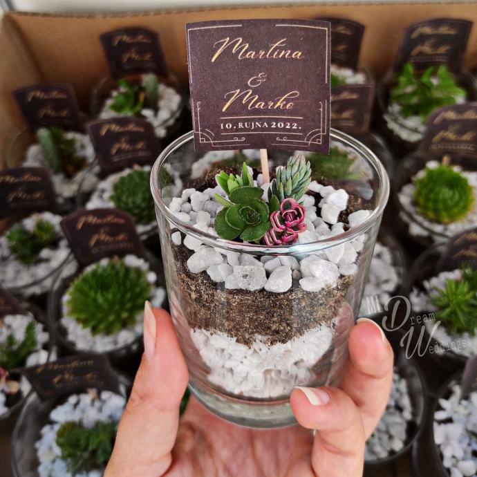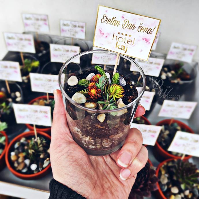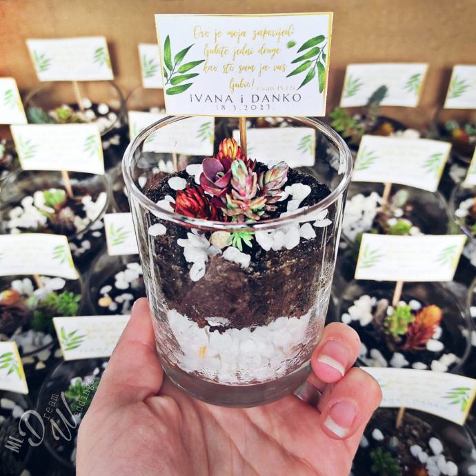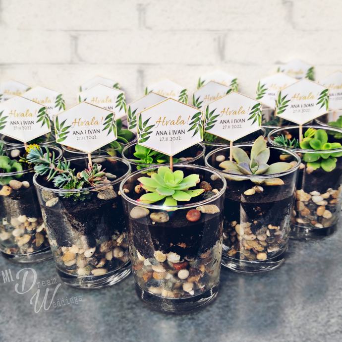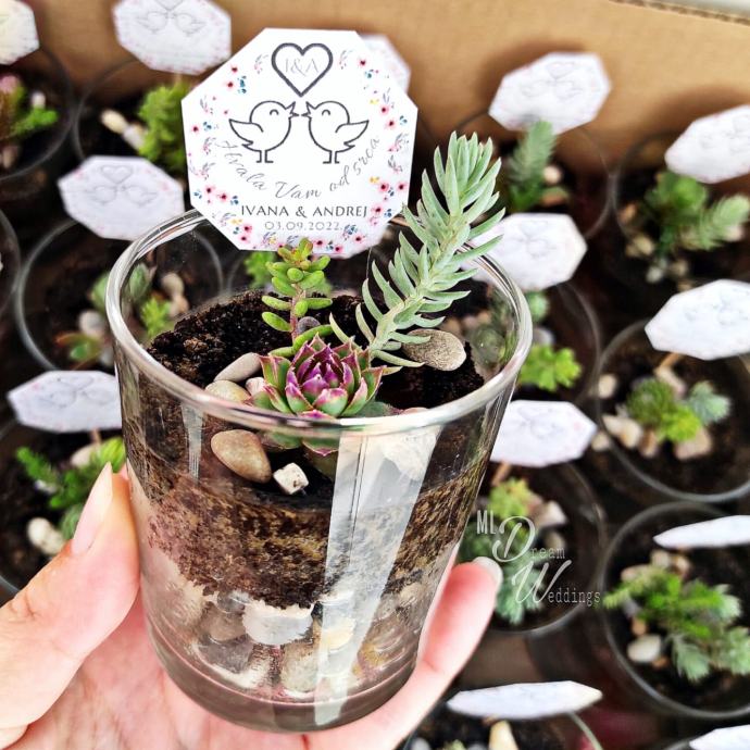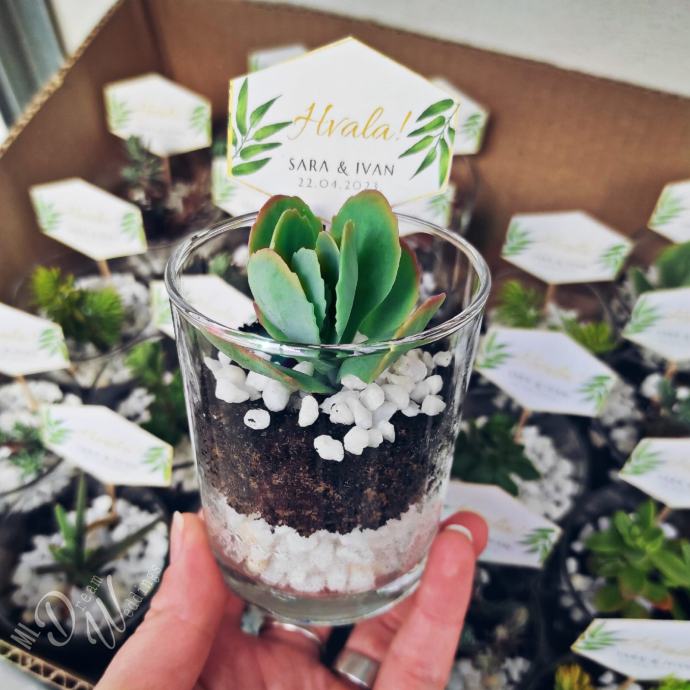 Zahvalnica uključuje sukulent, staklenu teglicu, ukrasne kamenčiće i ceduljicu sa zahvalom.