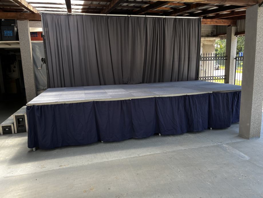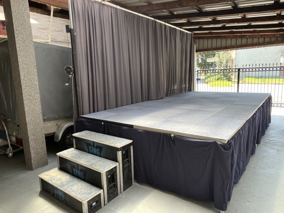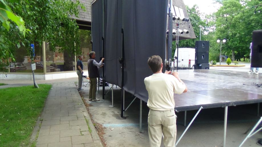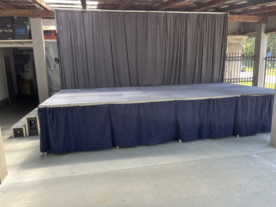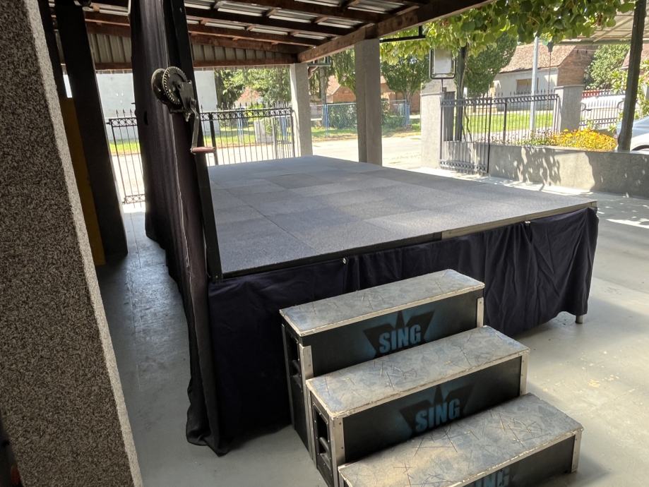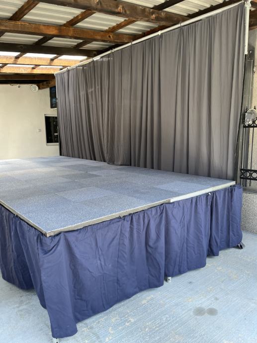 Kompletna pozornica sa zadnjim platnom ,nosačima,stepenice,tepison,prednje platno 8elemenata, 5,0mx2,5m ......................... 4000€