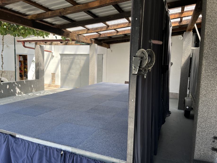 Kompletna pozornica sa zadnjim platnom ,nosačima,stepenice,tepison,prednje platno 12elemenata, 7,5mx2,5m / 5,0mx3,75m... 5000€