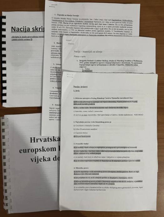 Kopirana knjiga (podcrtavana), kopirana skripta (podcrtana samo 2 odlomka), pitanja sa starih rokova, neka esejska pitanja, pitanja s merlina koje sam sama prepisivala i isprintala i rukom napisano nekoliko eseja za ispit.