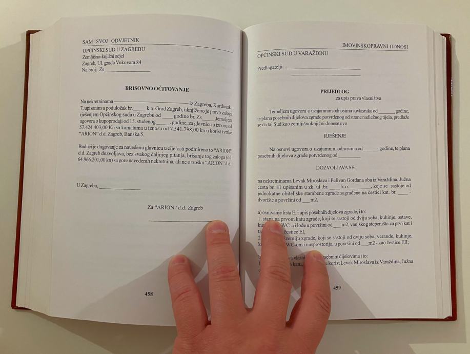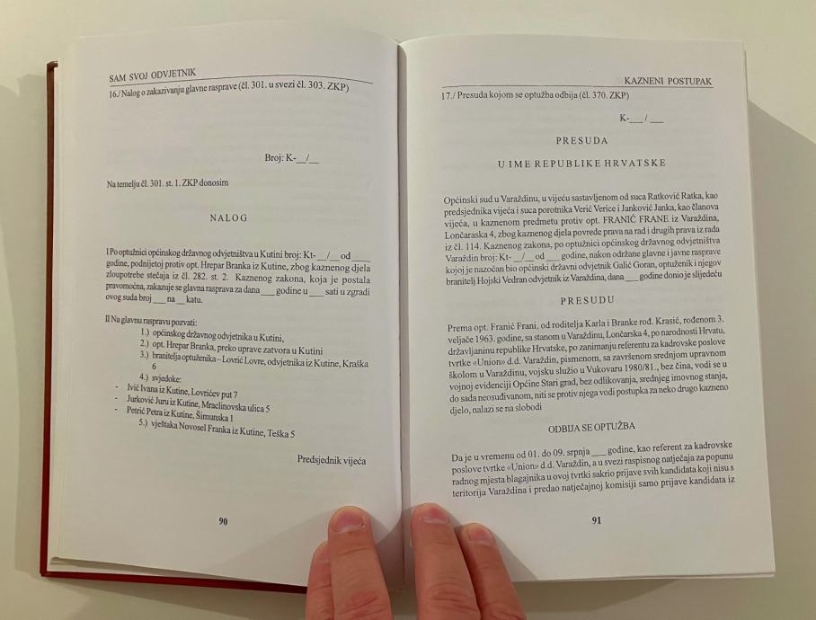 Knjiga “Sam svoj odvjetnik” predstavlja uvid u raznovrsne radnje i postupanja odvjetnika u postupcima pred sudovima i drugim tijelima. U ovoj knjizi je predstavljena problematika iz jedanaest različitih pravnih oblasti – kazneni postupak, parnični postupak, ovršni postupak, radnopravni odnosti, stečajni postupak, oblast ugovaranja, poslovnog dopisivanja te druga pravna područja. Materija je prikazana s kratkim uvodnim razmatranjem ili kompletnim pregledom cjelokupnog postupka, sukladno pozitivnim zakonskim propisima, s praktičnim primjerima pogodnim za postupanje. Ova knjiga će poslužiti kao praktikum i podsjetnik kako odvjetnicima, tako i pravnicima iz gospodarstva i državne uprave koji se sa predmetnom problematikom susreću i s drugih aspekata kroz svakodnevni rad i praksu, bez obzira na djelatnost. Knjiga je osmišljena kao pravna pomoć i okvirno uputstvo kod obavljanja određenih pravnih radnji, pa je, u želji da određenu materiju približi i osobama koje nemaju pravnu naobrazbu, jednim dijelom prilagožena laicima kako bi se i oni njome mogli poslužiti. Osim komentara knjiga sadrži i preko 400 praktičnih primjera za daljnju uporabu.