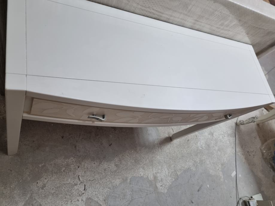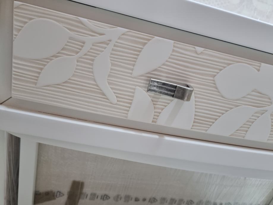 Ladica je sa zaustavljivacem tako da vi gurnete i ona se sama zatvori pred kraj bez udaranja.Ladica je zaobljena..Vrlo ljep komad namjestaja..novi..unikatan bez ijedne greškice.