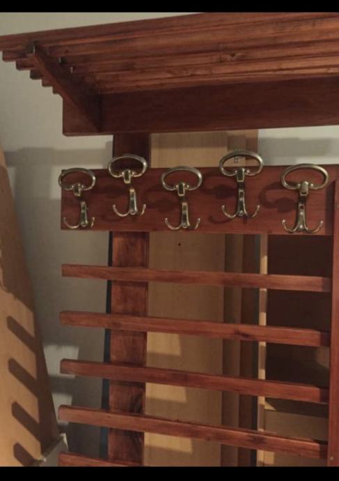 Vješalica napravljena od punog drva. Vrlo čvrsta i može držati puno kaputa i na vrhu može držati kutije ili torbe ili kape i šešire. Ručni rad.